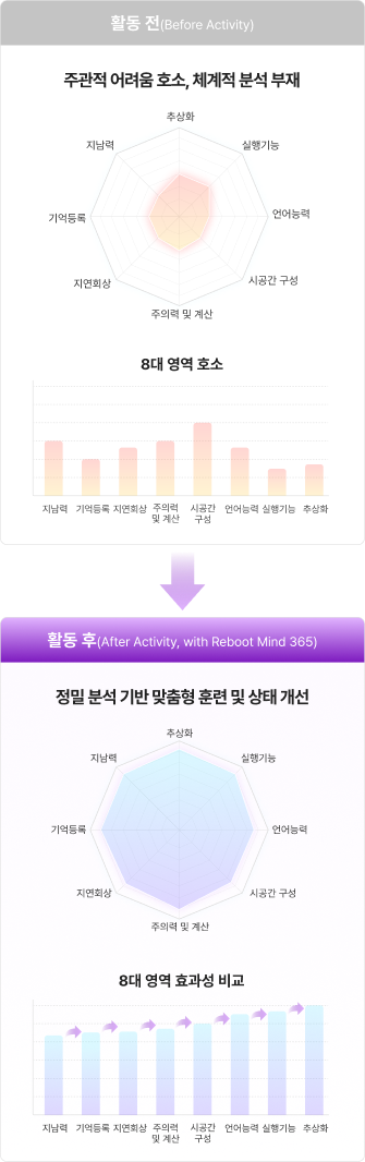 단순 반복이 아닌 상태 기반으로 설계된 개별화 훈련을 통해 인지 기능 향상을 체계적으로 지원합니다.